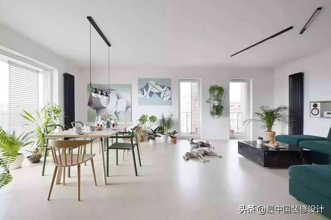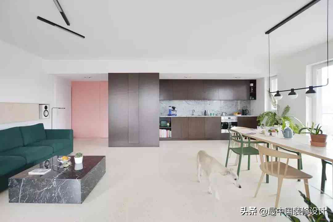整个公共空间,宽敞到让人羡慕,连狗子都能在家里愉快地撒欢。