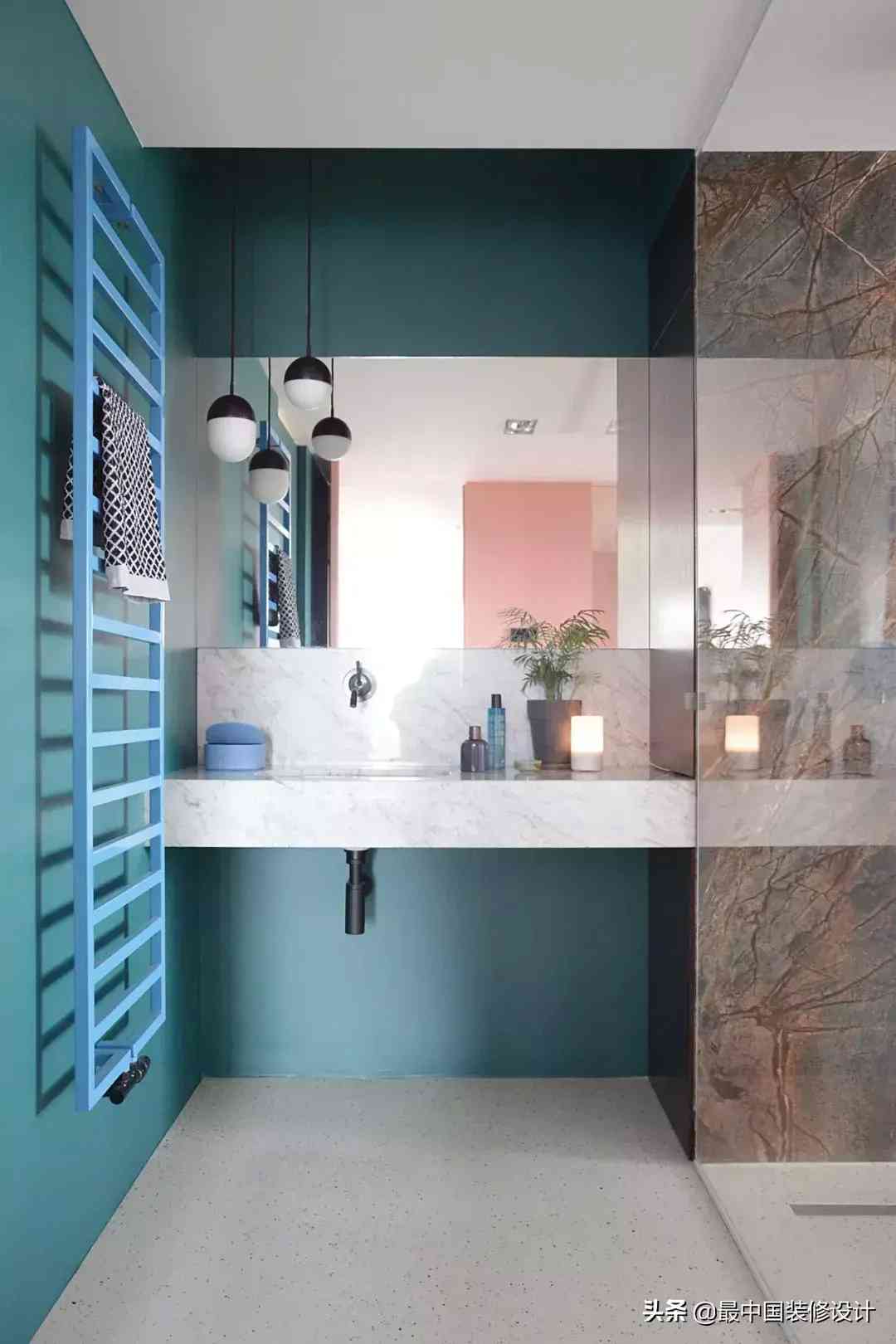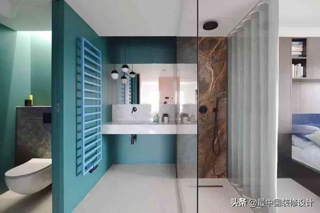 干区的马桶间和半干区的洗漱台都用了墨绿色的墙漆。只在淋浴和壁挂马桶的封墙区用了大理石墙砖……你基本不用担心湿气问题,这样宽敞的空间里,湿气都几乎可以忽略不计,省去了贴砖的材料费和人工成本。