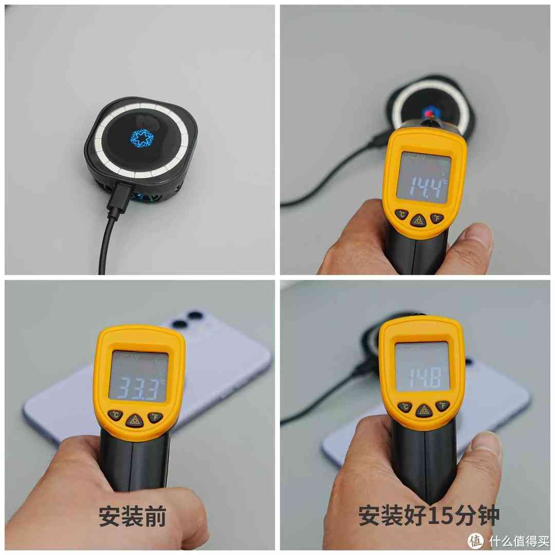 散热器散热效果也很出众,运行15分钟后散热器内表面已经出现冰霜,用温度计实测降到14.4°C。安装在手机上测试,运行15分钟后手机背板从33.3°C降到14.8°C。给女友手机安装上它,不论室内还是室外,手机都能不惧高温酷暑,保持低温运行,算是给她增加了技能buff!