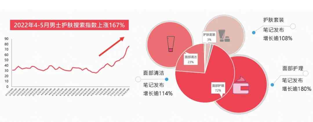 根据小红书的数据分析,男士护肤搜索热度不断攀升,2022年4-5月搜索指数上涨167%,男士护肤的笔记也呈整体上升趋势,增长超过60%。