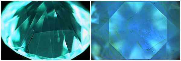 合成钻石:高温高压合成钻石的发光图像常有沙漏状生长纹,CVD合成钻石可见层状生长纹。