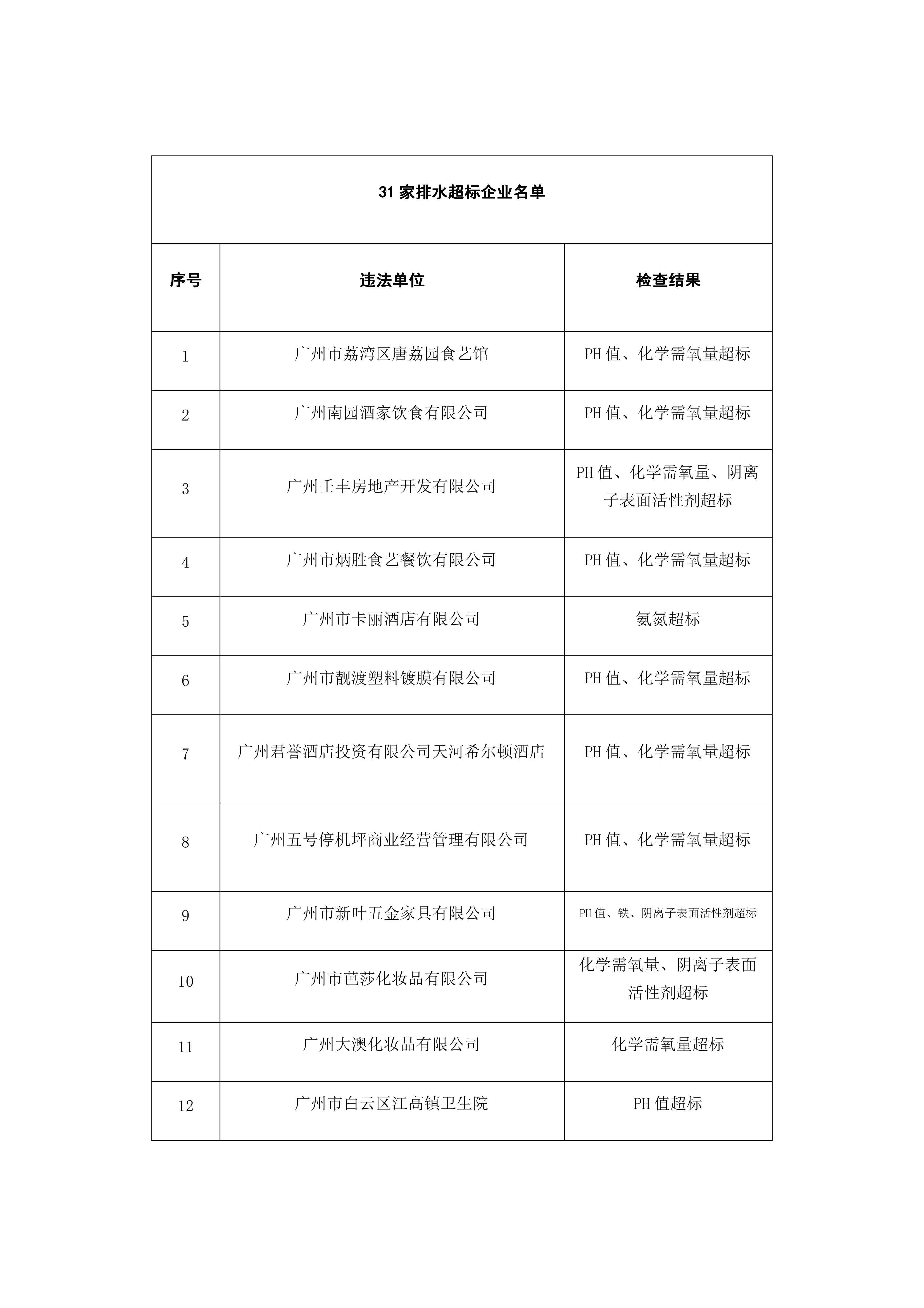 今日(1日),广州市水务局公布了“违法排水执法行为立行立改”专项行动的检查结果,31家企业因排水严重超标被点名批评。其中炳胜餐饮、南园酒家、泮溪酒家、天河希尔顿酒店等知名商业企业都有份。广州市水务局执法部门负责人表示,下一步将从严从重打击典型非法排水户。