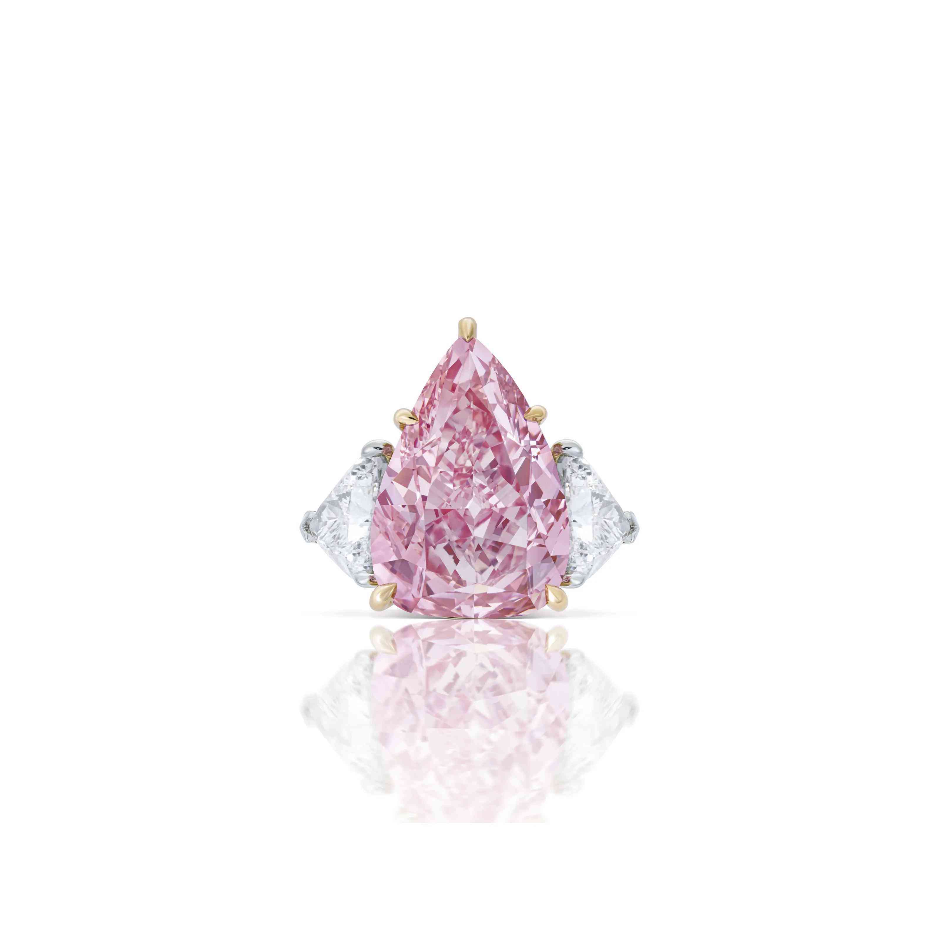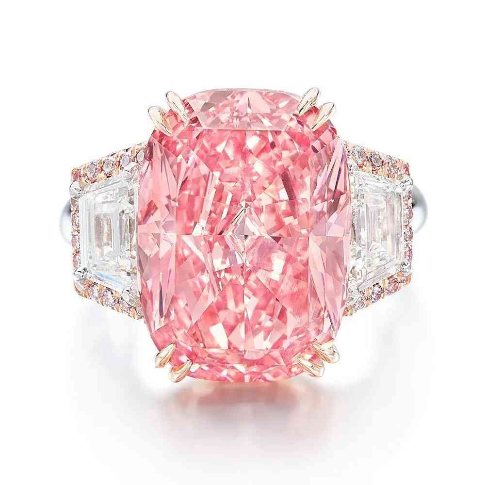 这颗粉红钻石两边各镶有一颗纯净白钻,配以18K玫瑰金和白金戒托。在香港拍卖时,它以超过最高估价近三成的价格落槌,而这样的结果也体现出亚洲市场对彩色钻石的强劲需求。