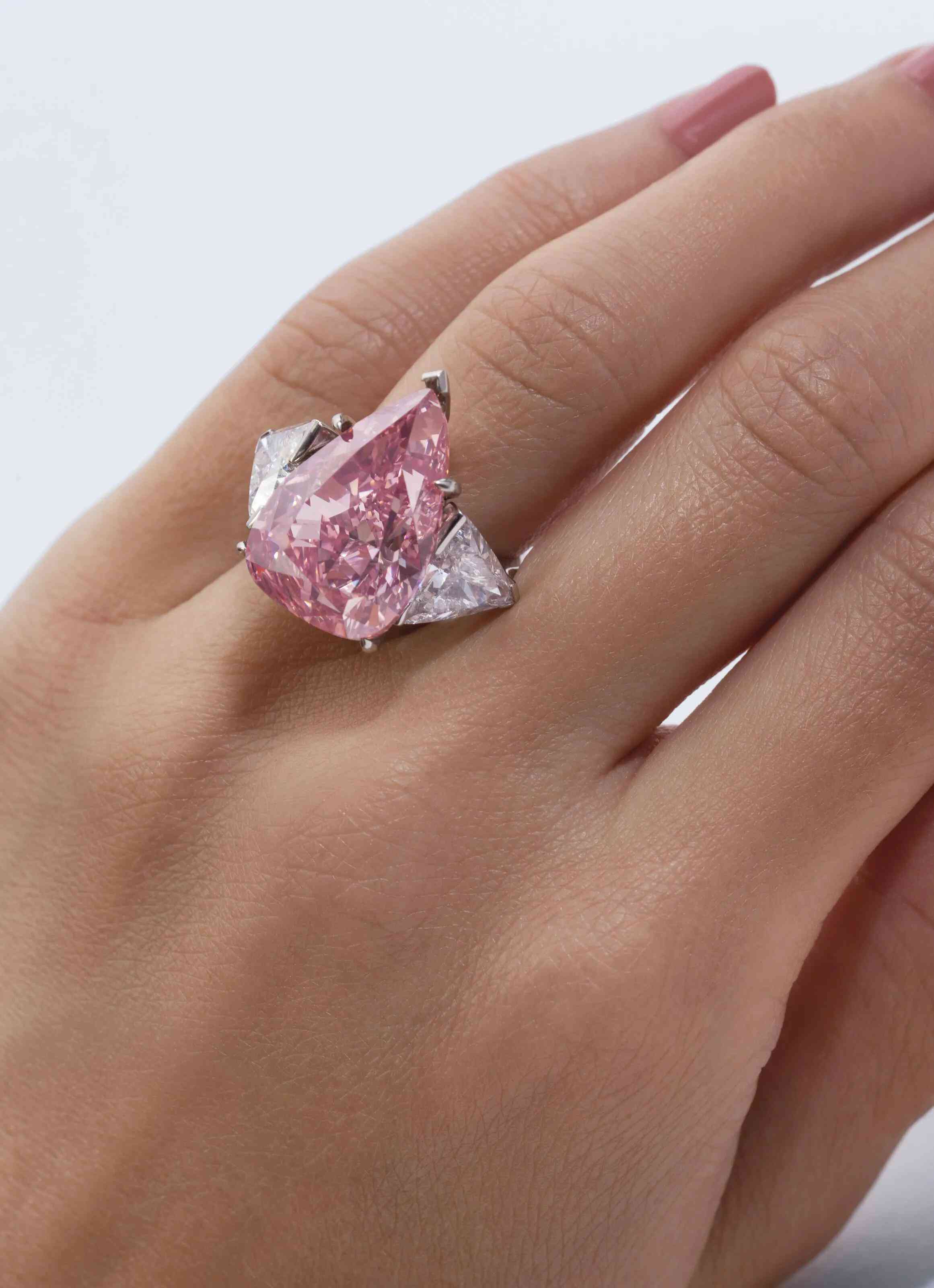 “The Vivid Pink”镶嵌在英国珠宝商格拉夫(Graff)设计的铂金和18K玫瑰金戒指上,两侧饰以盾形钻石。这颗粉红钻在香港拍卖时,以超过最低估价两倍的价格成交,刷新了当时粉红钻的单克拉价格纪录(2,155,332美元/克拉),此纪录直到2017年才被佳士得拍出的另一枚绝色粉红钻“The Pink Promise”打破。