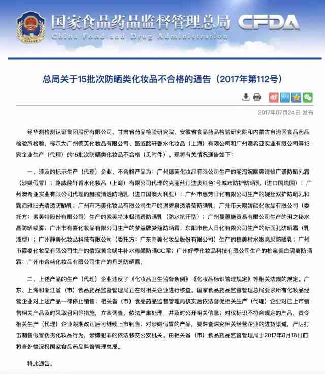 近日,国家食药监总局发布《关于15批次防晒类化妆品不合格的通告》!