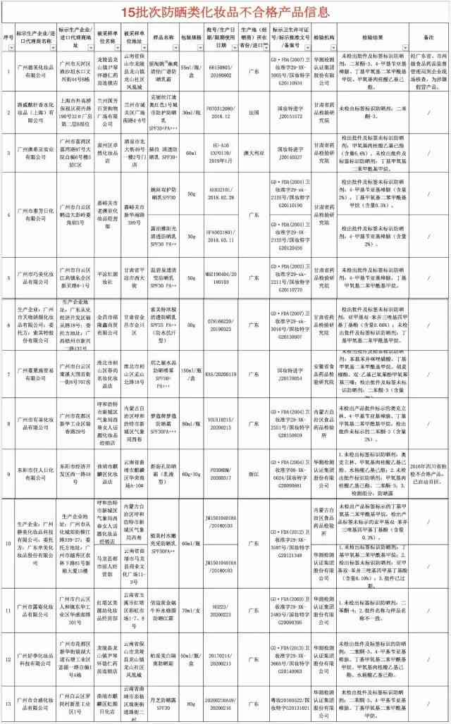 经检测,13家企业生产(代理)的15批次防晒类化妆品不合格!