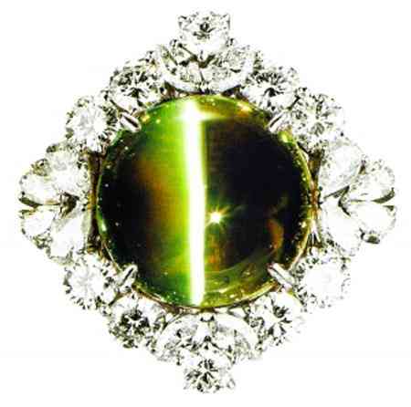 金绿猫眼,眼线正、质地纯,价值并不逊于钻石,更重要的是,其独有的润泽和眼线形成的流光溢彩,极具装饰效果,与高雅装束十分相配。金绿猫眼中,有蜜黄、葵花黄、苹果绿、灰、酒黄等颜色,虽然每种均有极品,但还是蜜黄色更适合中国人的肤色。