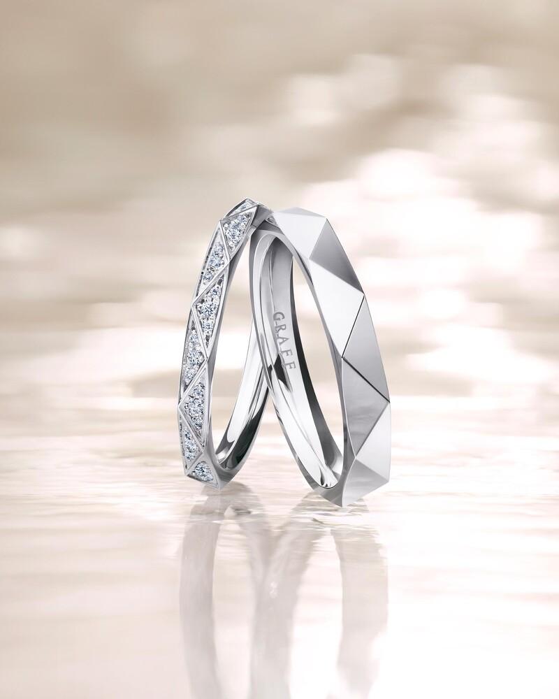 车工是决定宝石外型轮廓,以及火光表现的关键要素,而深按此道的宝石大亨 Graff 便取完美车工的钻石折射面,注入品牌最具代表的经典Graff Signature 戒指系列,小而巧的戒圈乘载了不同角度与切面,或加上闪亮镶钻点缀,大气又有个性让人眼睛为之一亮,是记忆度与询问度皆高的对戒。