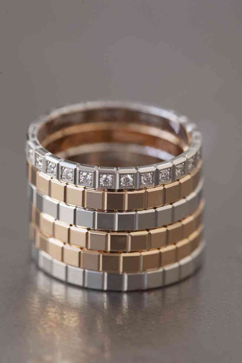 萧邦Ice Cube系列以精致小巧的立方体造型组成,或抛光处理或镶嵌钻石,细密排列成行,单独穿戴或随意层叠混搭,皆值得多看几眼!