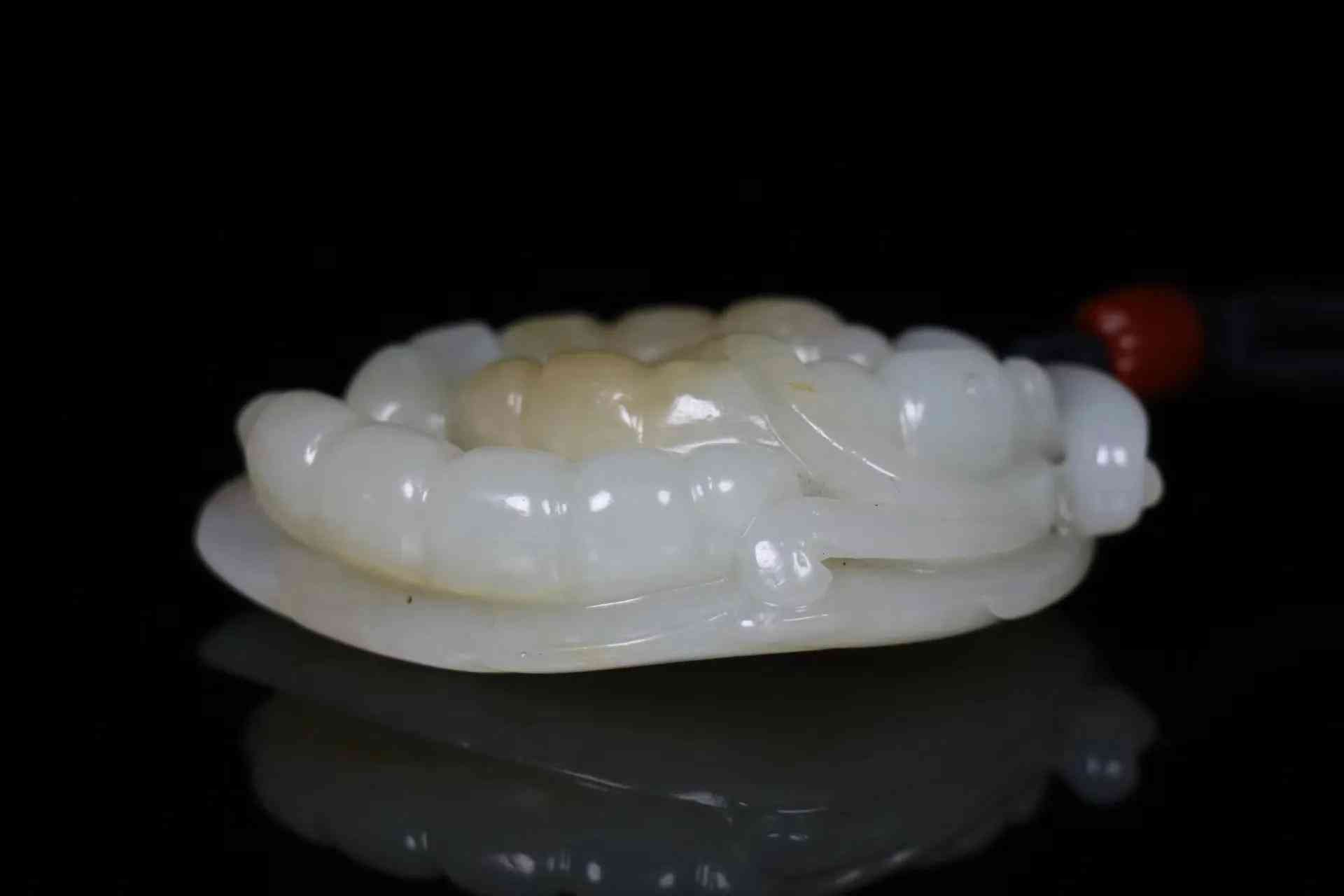 取上乘和田玉料,玉质紧密,油性突出,随形浮雕春蚕纹,蚕通缠,寓意腰缠万贯,雕刻技艺高超,寓意深长,线条清晰,包浆厚重