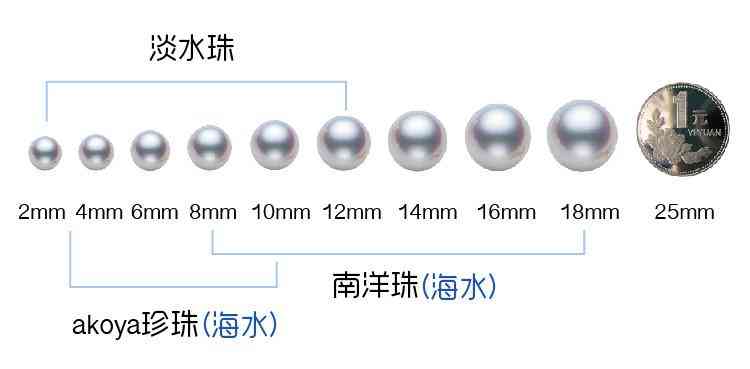 南洋珠(南太平洋地区产出的海水珍珠)的母蚌一般一个只可产出 3-5 颗珍珠,颗粒较大,直径在 8-18mm,最大可达 20mm 以上;日本 akoya 海水珍珠(阿古屋产出)一般直径 3-10mm;淡水珍珠的珠母贝一个可以产出 30 颗左右,直径 2-12mm 比较常见,大的可以到 16mm 左右,比较稀有。