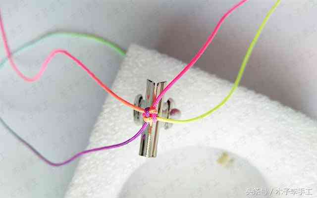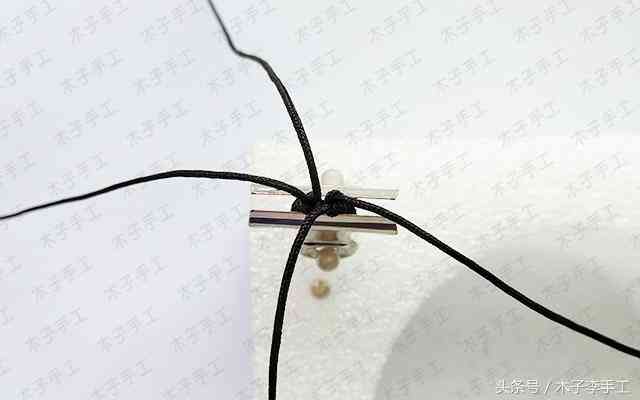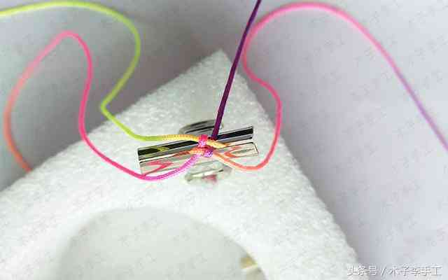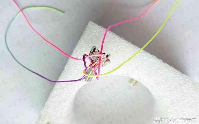 2、用夹子固定蛇结,将线分布到不同的四个方向,开始编玉米结