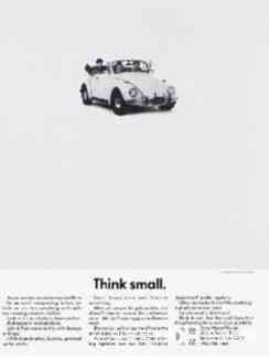 “think small”的广告,直截了当地提醒人们试着换角度思考;接着正文描述:这车真的很小,外观也没什么新奇,以至于轻易就被忽视掉。就连真正驾驶它的人,也没注意过它确实很省油,还不需防冻剂;而当你挤停车场、换保险金、支付维修费、以旧换新时,想想还是小一点的好。