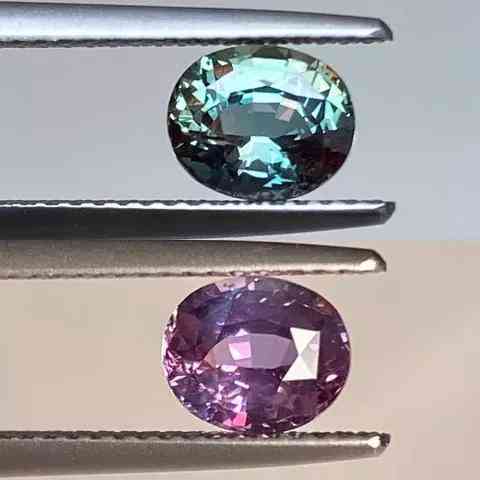 这种石头以其在日光下从绿色变为人造光下的红色的非凡能力而闻名。这是由于宝石中的铬、铁和钛以及这些元素吸收的光谱颜色。亚历山大变石有时被称为“白天的祖母绿,晚上的红宝石”。
