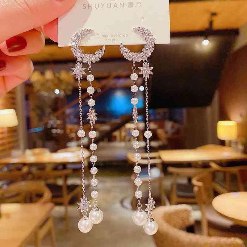 东大门夸张时尚星月长流苏珍珠耳环韩国气质网红个性百搭银针耳饰