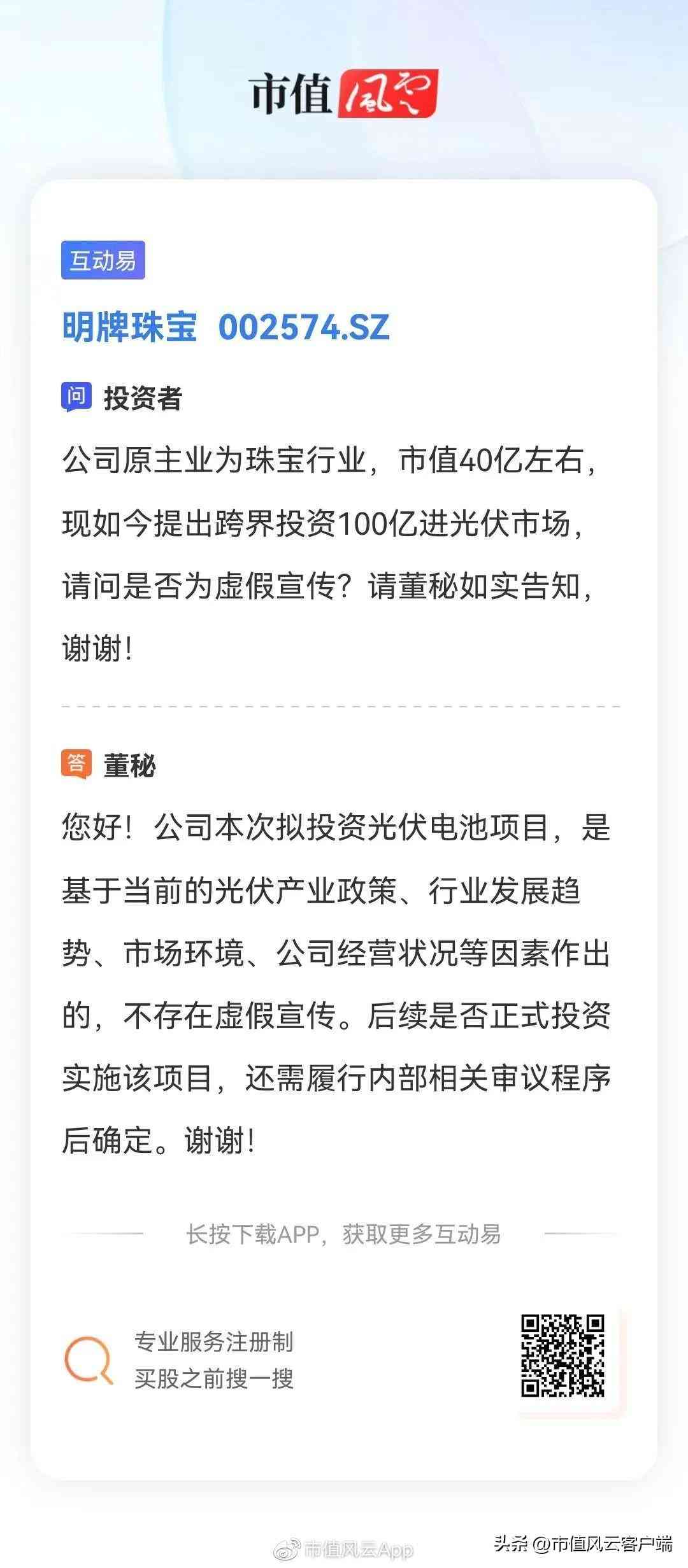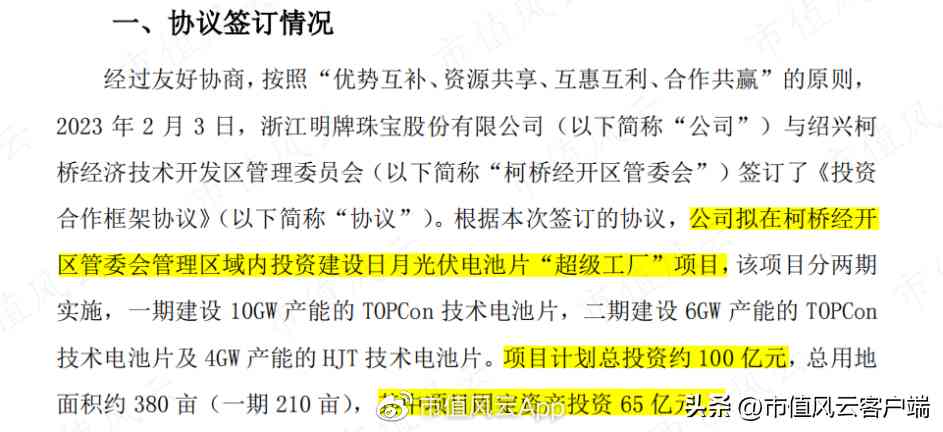2月3日晚间,明牌珠宝平地一声雷,库嚓一下,撇出一份百亿跨界光伏电池片的公告。
