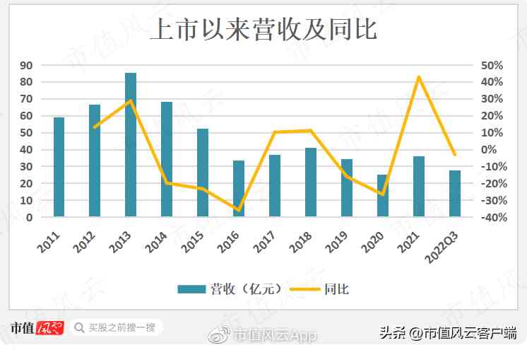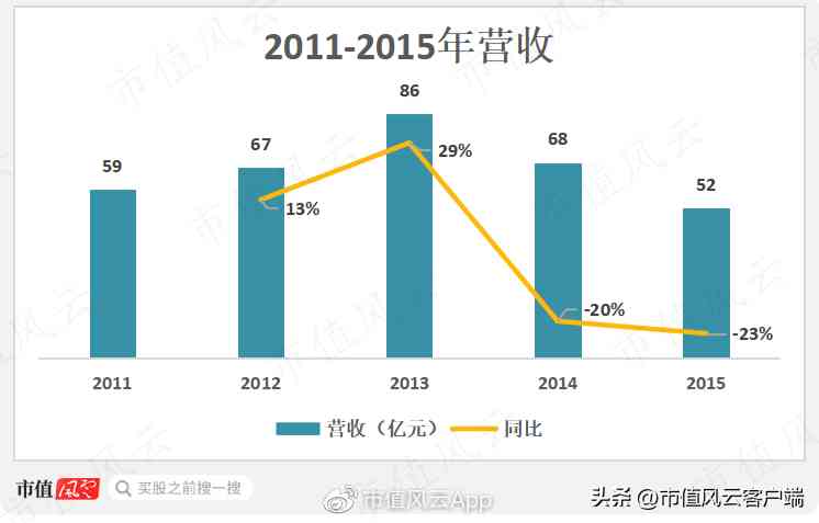 与之相对应的是,公司营收规模在2013年达到86亿,是有史以来的巅峰之时,随后便是连续两年超20%的下滑。