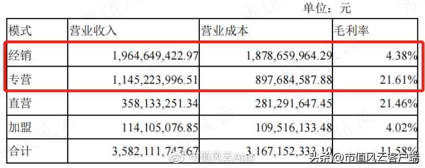 销售模式以经销和专营为主,合计占营收比重达87%。其中,经销是主要方式,但其毛利率(仅4%)远低于专营(22%)。