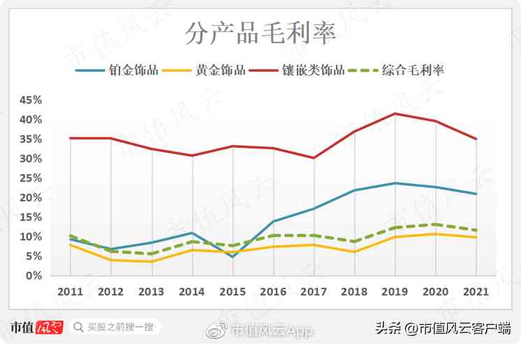 在近些年金价上涨的基础上,公司黄金饰品毛利率小幅改善,2021年近10%,同期公司综合毛利率12%。