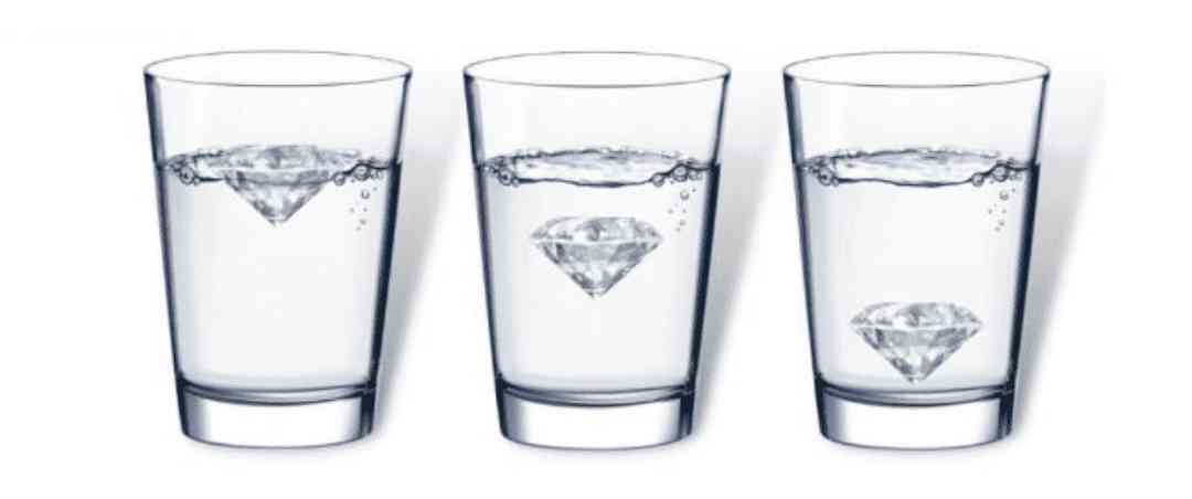 取一个正常大小的水杯,将其四分之三的部分装满水。现在,小心地将钻石放入水中。如果沉没,钻石就是真的;如果它漂浮在水下或水面上,那么您得到的是假钻石。这是因为原始钻石的密度更高。
