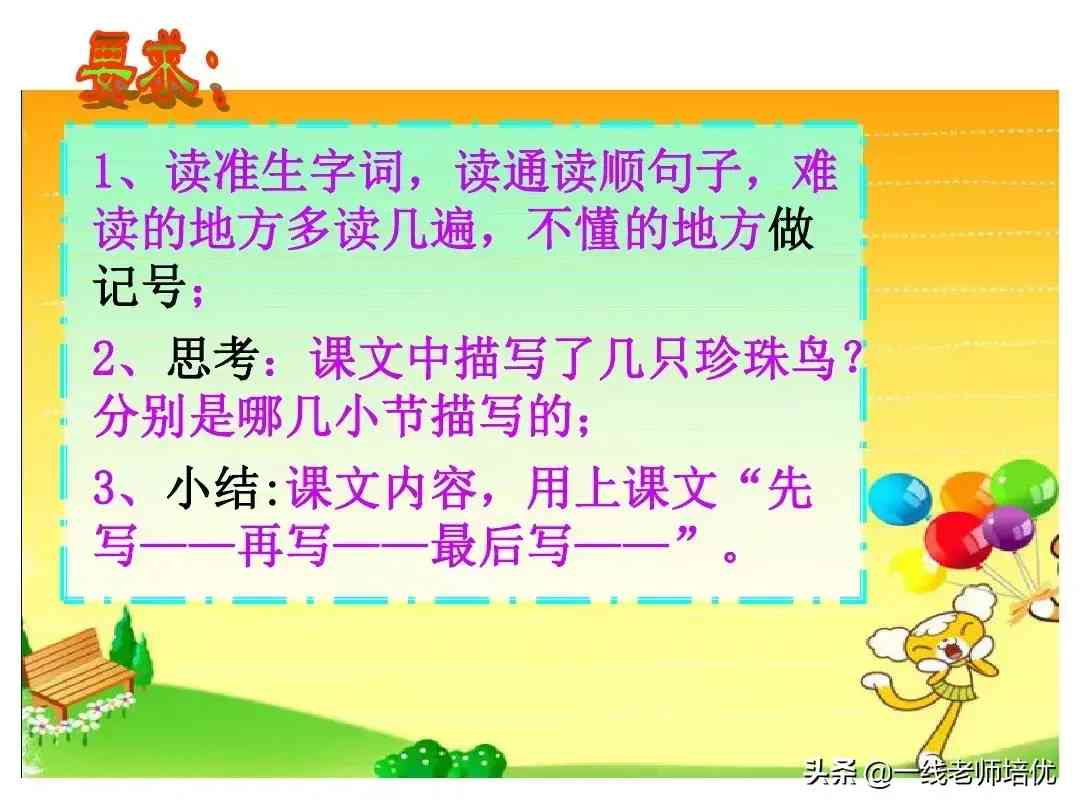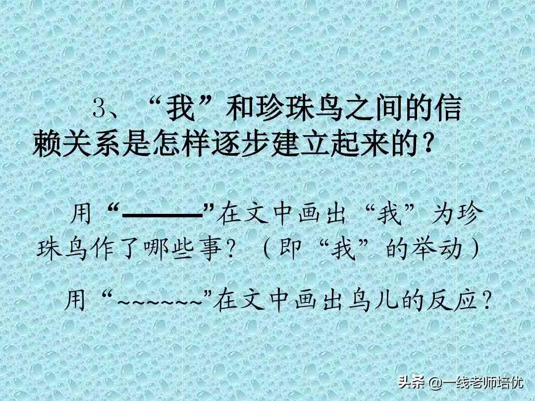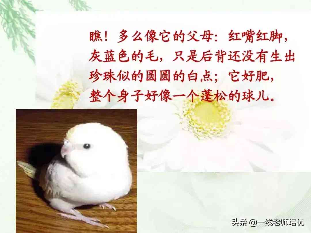 第二段(2-12):写可爱的雏鸟出生了,在“我的呵护下健康成长,“我”取得了小珍珠鸟的信赖,与它建立了亲密无间的友谊。