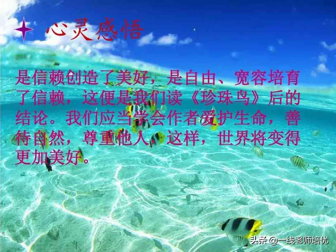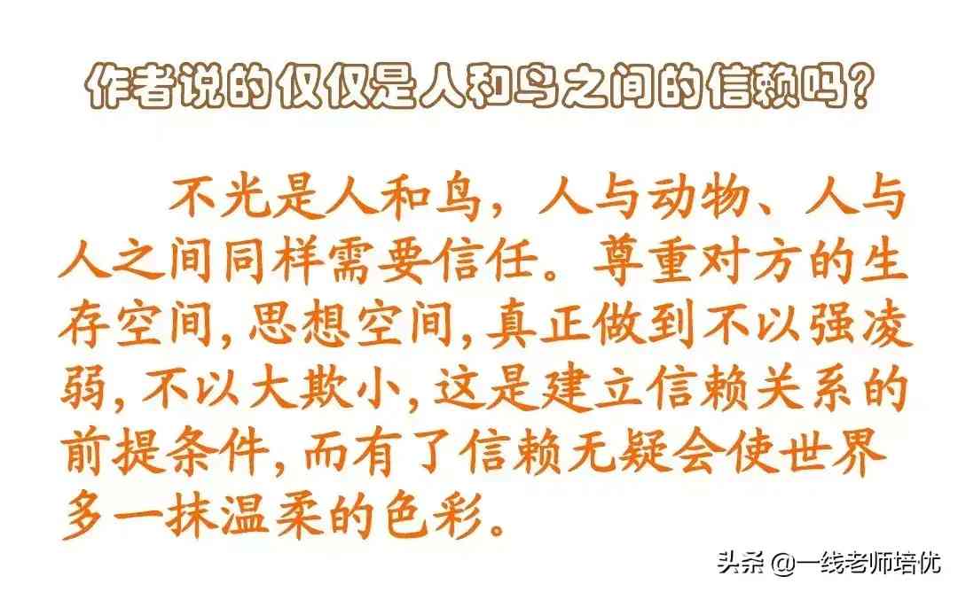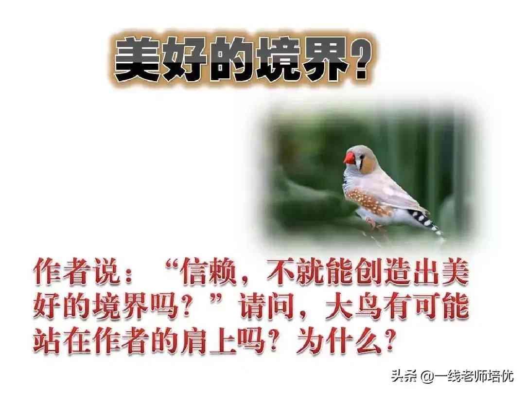 这篇本文叙述了“我”和珍珠鸟从相识、熟悉、亲近到信赖的关系变化过程。谱写了一曲人与动物和谐相处的爱的颂歌,告诉我们:信赖,往往创造出美好的境界。