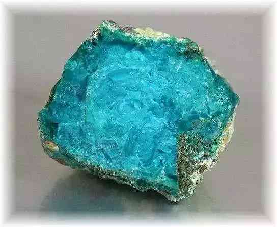 内部结构为晶质集合体,常呈纤维状集合体,可见皮壳状结构条纹状、同心环状结构。丝绢光泽至玻璃光泽。摩氏硬度:3.5~4。密 度:3.95(+0.15,-0.70)g/cm3。
