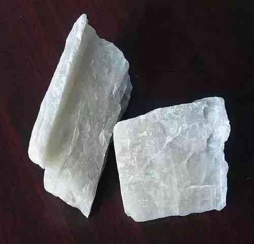 内部结构为晶质集合体,常呈片状或板状集合体。玻璃光泽,解理面上显珍珠光泽。摩氏硬度:2~3。密度:2.38g/cm3 ~3.40 g/cm3。折 射 率:1.57。
