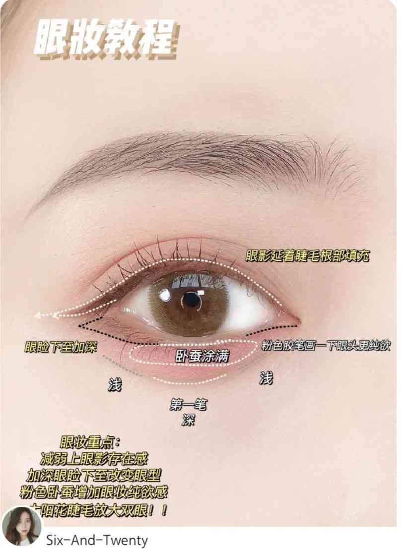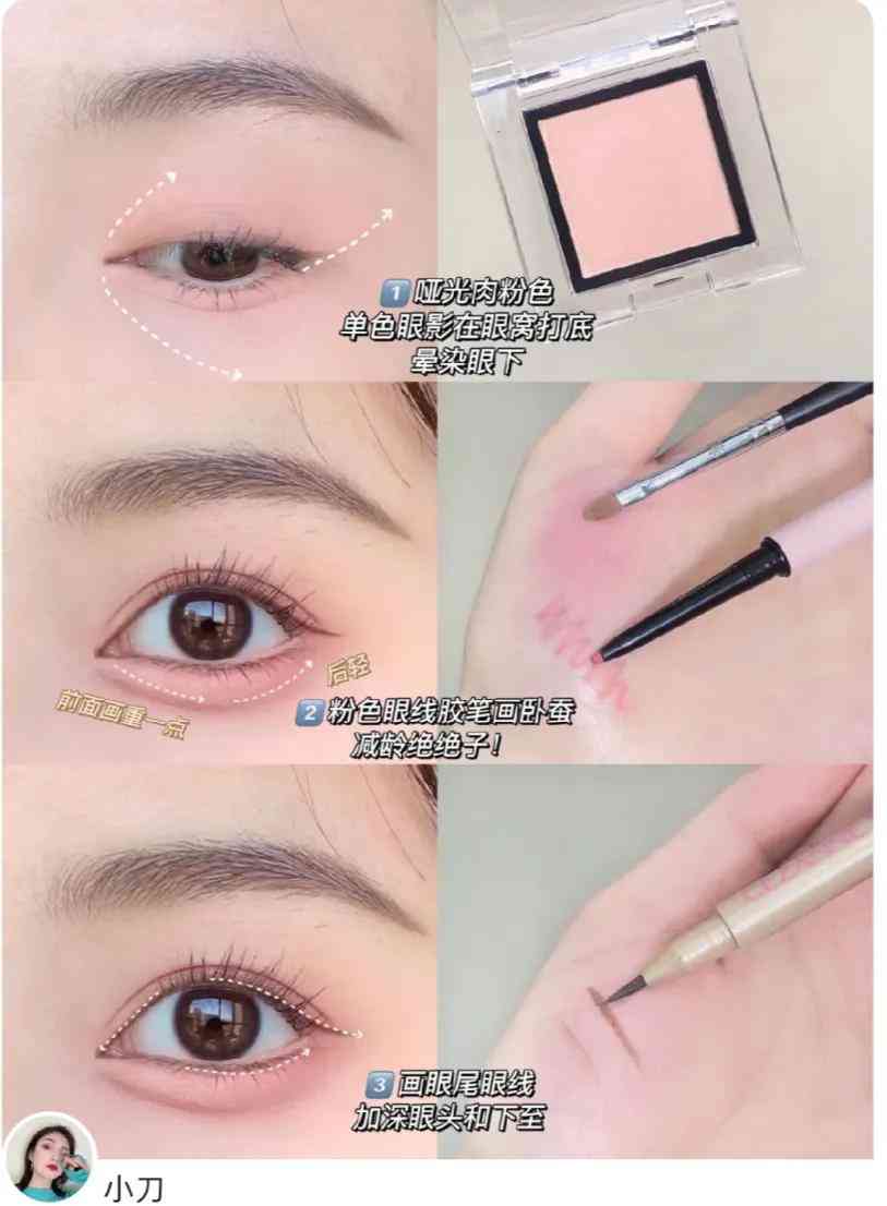 这款妆容的不同之处,就是使用粉色的眼线胶笔来画卧蚕。