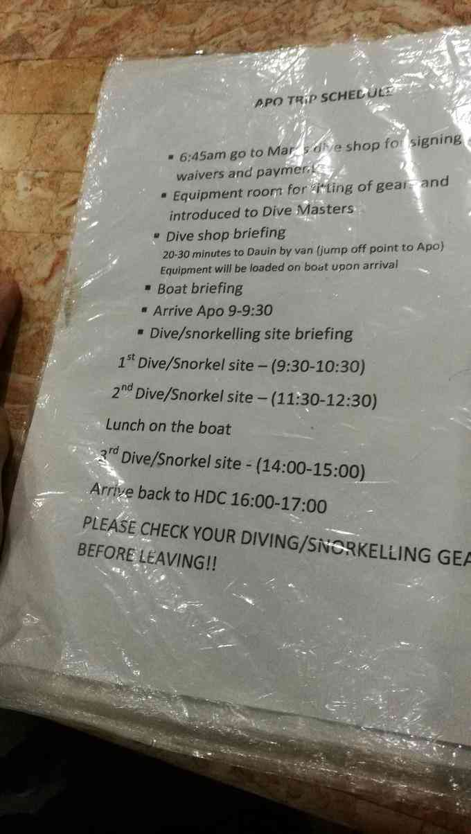 2:跟团,哈罗德潜店(Harold’s)报Apo岛浮潜团,Apo岛浮潜一日团1200P/人全包,一天三潜,深潜3500P,到潜店会给每个人一件救生衣,一对脚蹼,一个面镜和一根呼吸管。