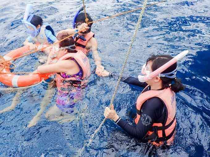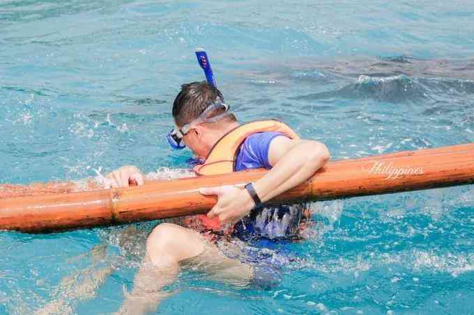 由于风浪太大,浮潜的人一定要抓住螃蟹的脚不能松手,而螃蟹船又晃得太厉害,抓着更累.试着放开手,结果划船的哥哥马上叫他抓好,不可以自己游出去