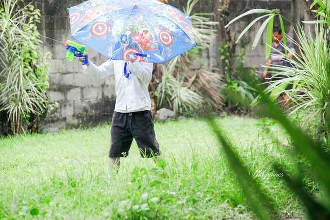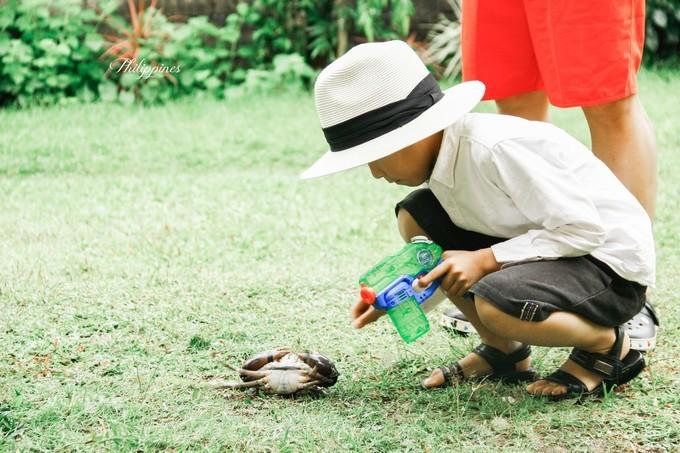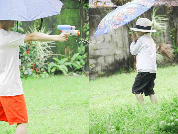 玩完螃蟹玩老爸,下雨天都要陪他打水枪.