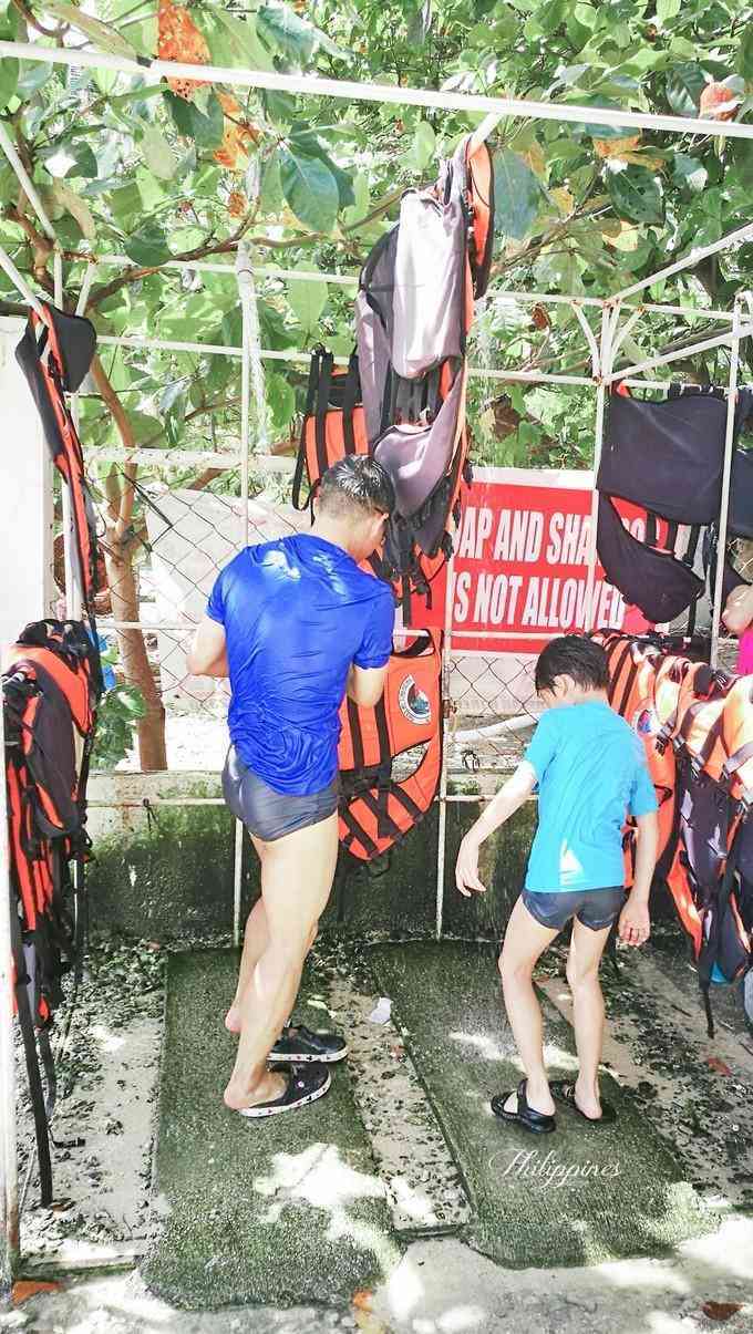 买完票车子直接开司海滩边,租了一个在岸边的遮阳伞200P,足够10个人坐,还有桌子放东西,换衣服,洗手间,冲水都免费,35P的门票已经包含这些费用.租一件救生衣只付100P就可以,押金什么的不需要交,用完自己放回去就可以,也不会有人问,菲国的人民真的不要太实诚.