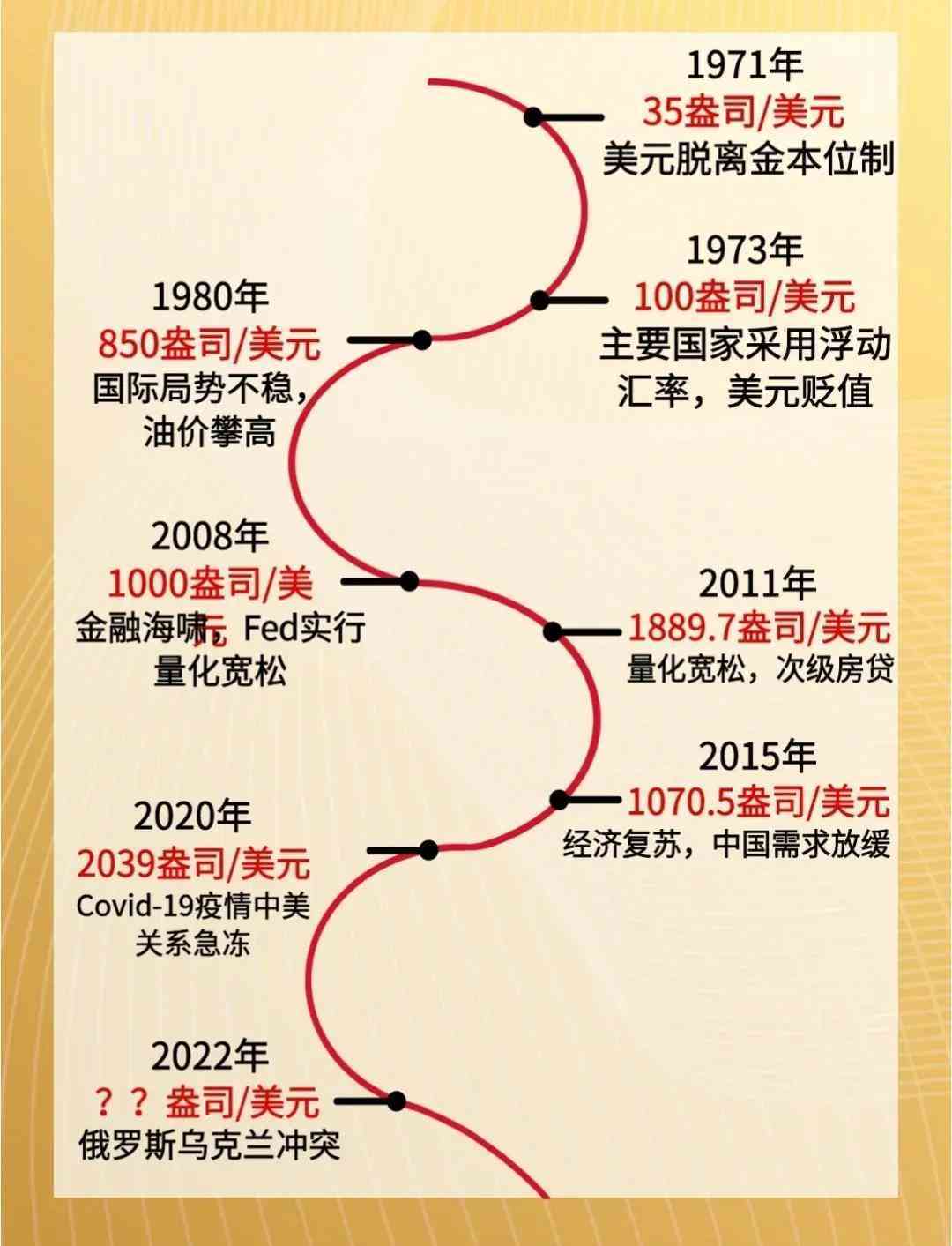 1971年8月,美元脱离了金本位制,并将一盎司黄金的转化率固定位35美元,这是金价最早开始被国际记录、交易的价格。