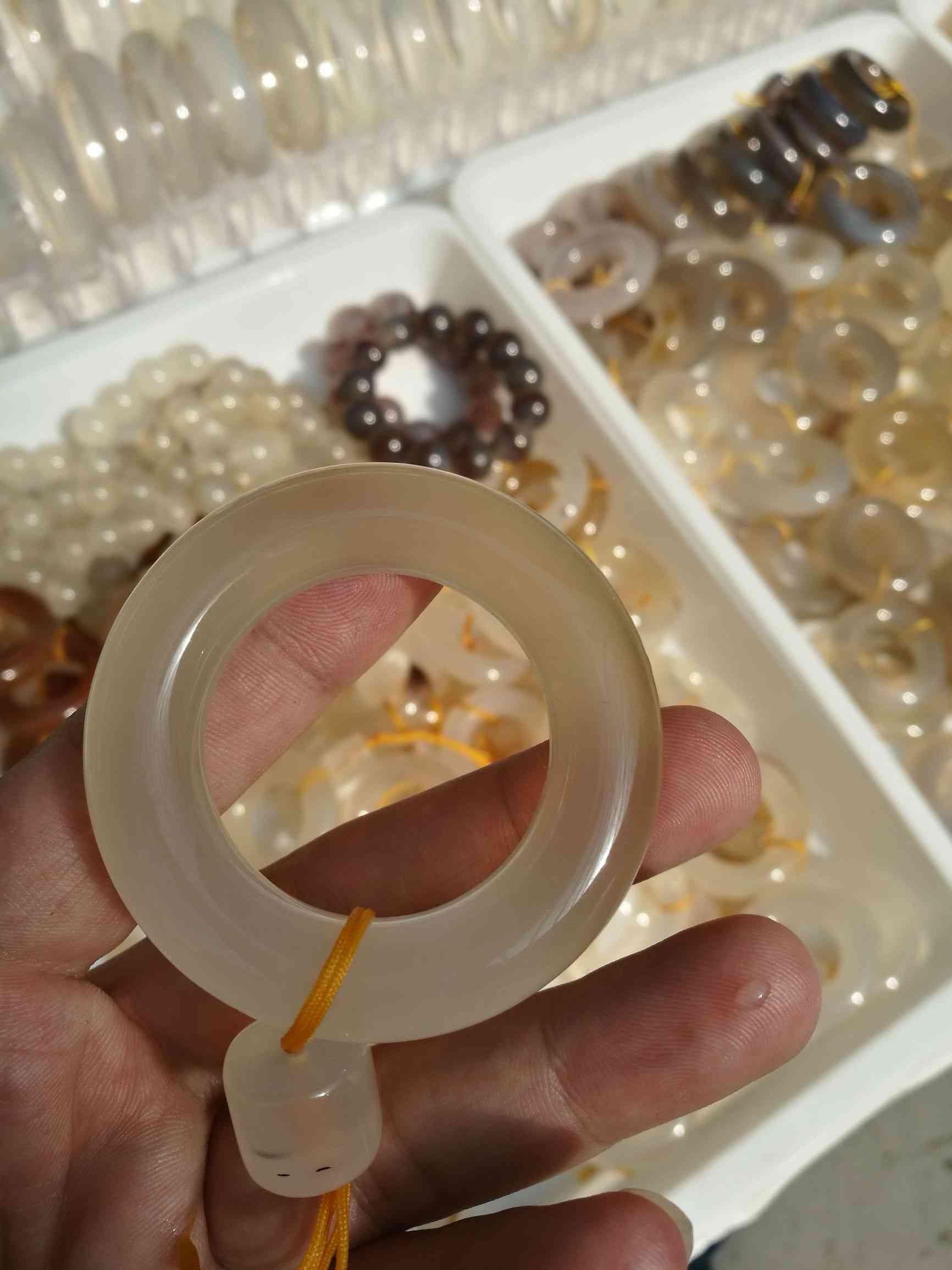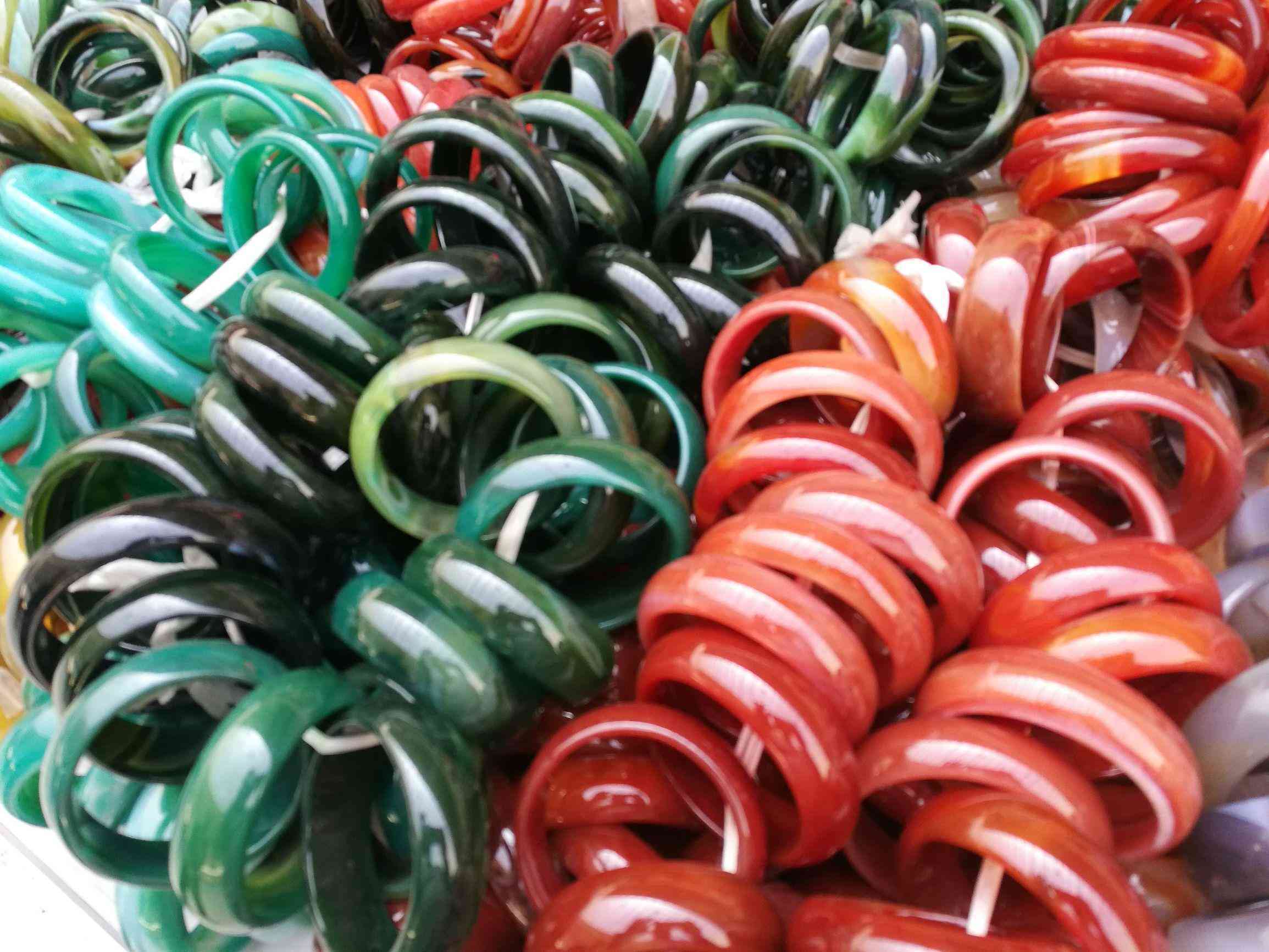 这样的是天然玛瑙石制作的手镯,颜色通透,在十家子批发的价格在50元左右。