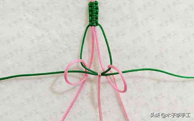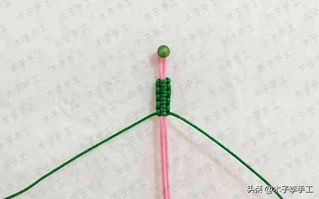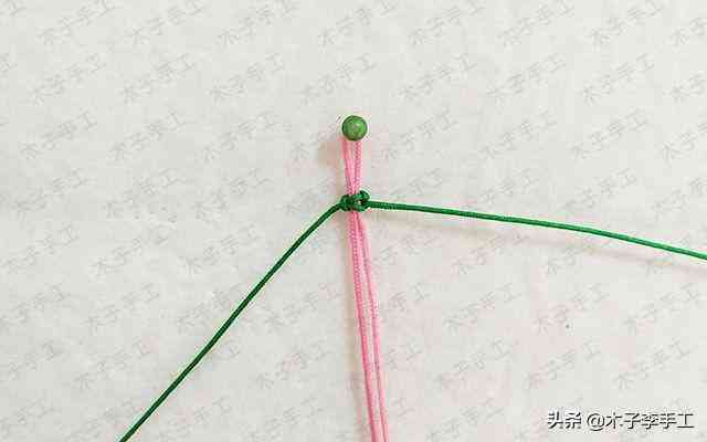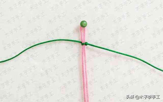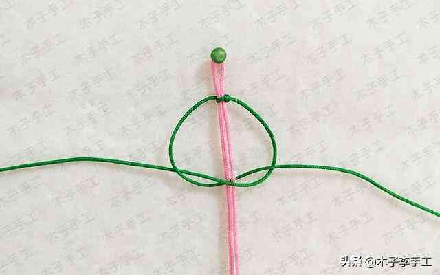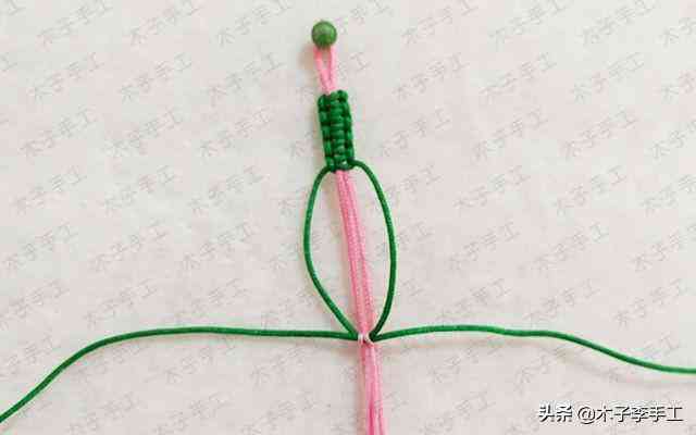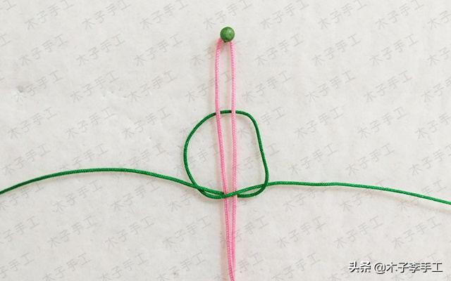 6、两根绿色的线交叉,一根100cm的粉红色71号玉线对折后在绿色线上做雀头结挂住