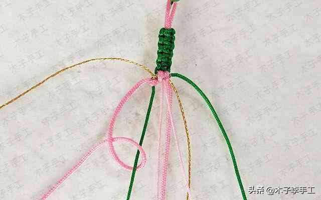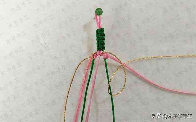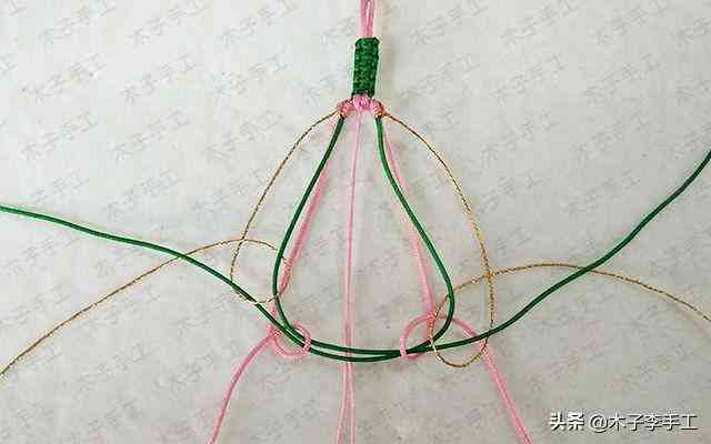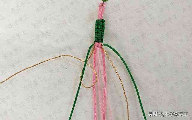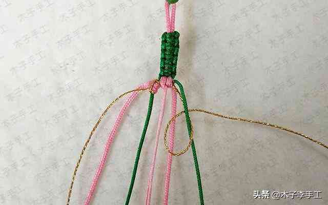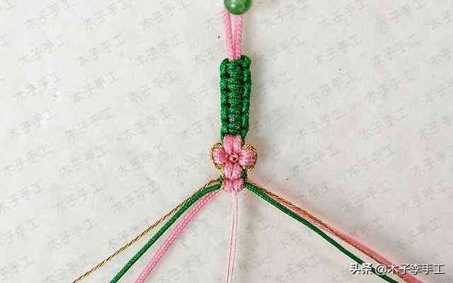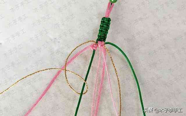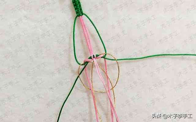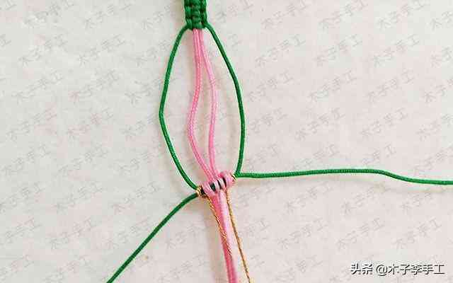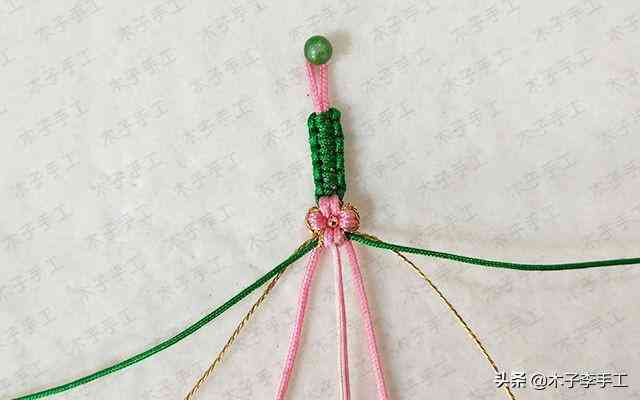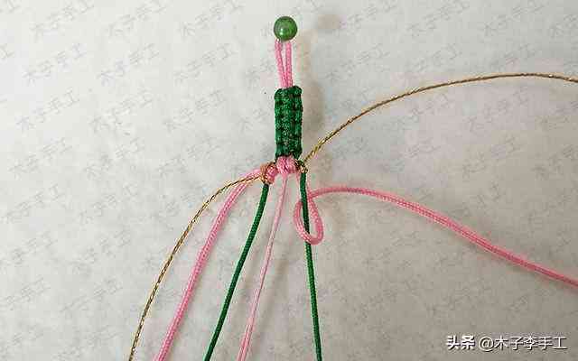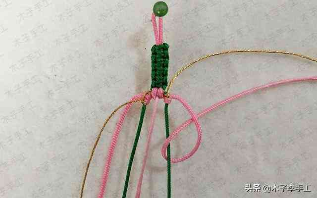 22、根前面一样,绿色线再次交叉,金线和粉红色A玉线分别在左右两边绕一圈