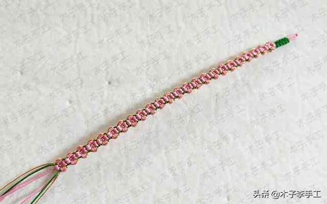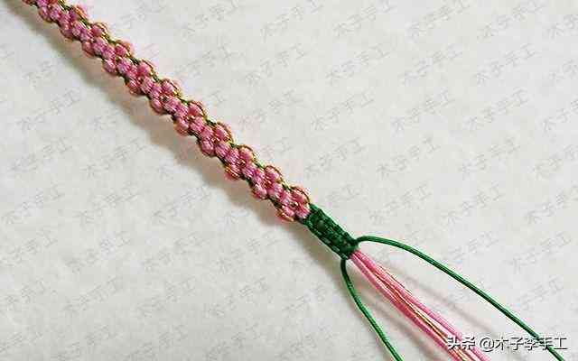 8、一根160cm的6股金线对折后两个线头分别穿入绿色线和粉色线形成的2个洞里