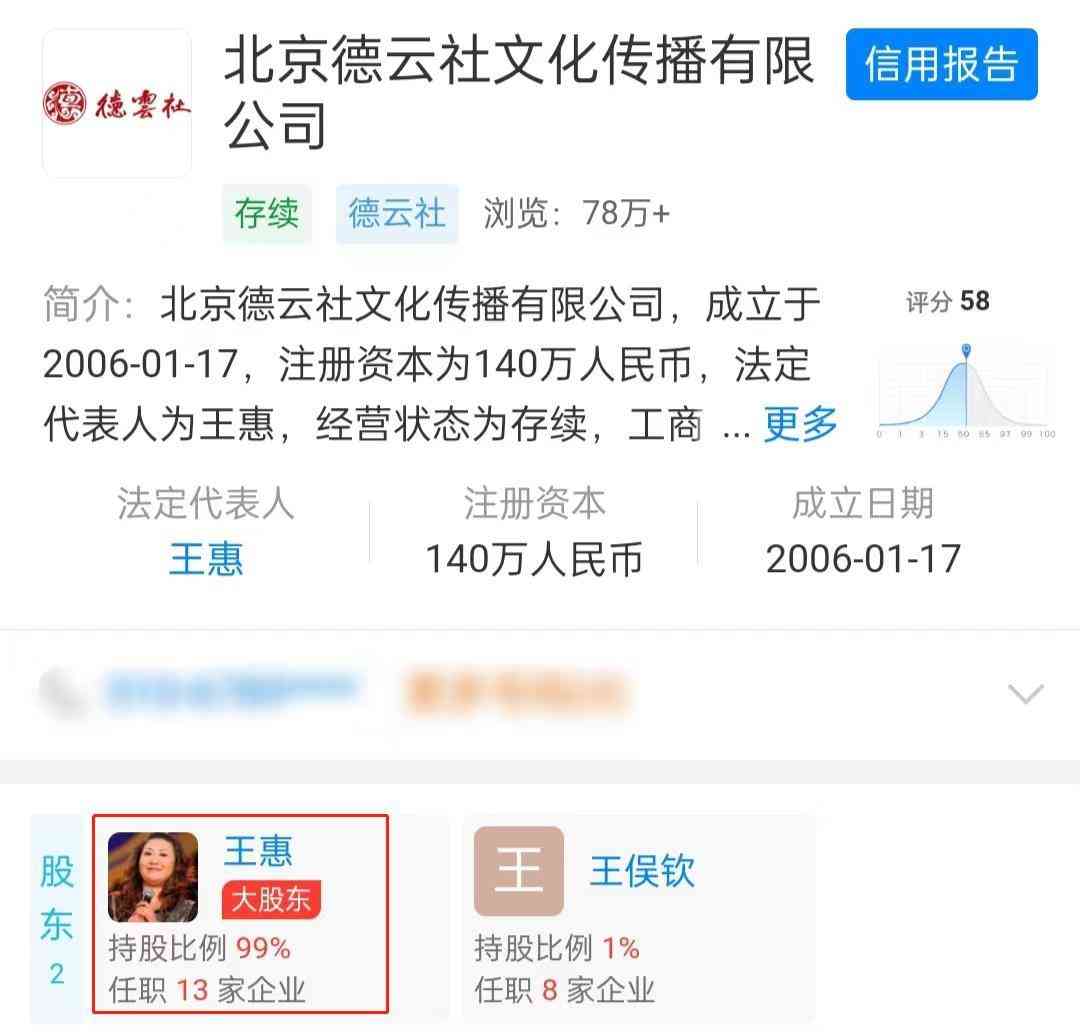据相关资料显示,王惠是北京德云社文化传播有限公司的法定代表人兼董事长,持股99%,剩下1%的股份则在王惠弟弟手中,德云社几乎可以说是王惠一个人的天下。