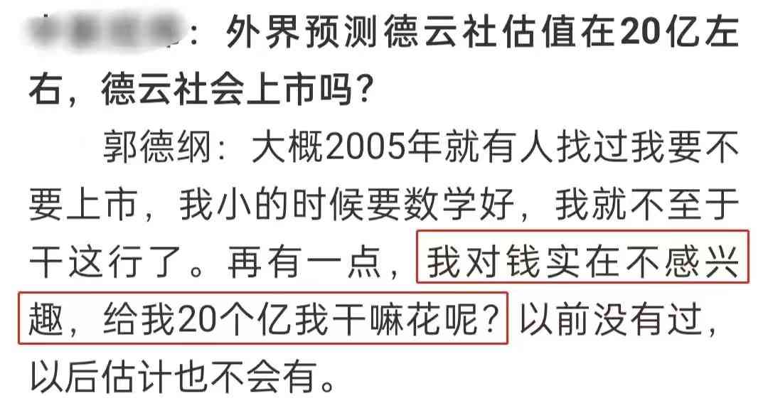 曾有相关人员为德云社估值20亿,不过郭德纲却十分“凡尔赛”地表示自己对钱没兴趣,他的所有资产都在妻子手里。