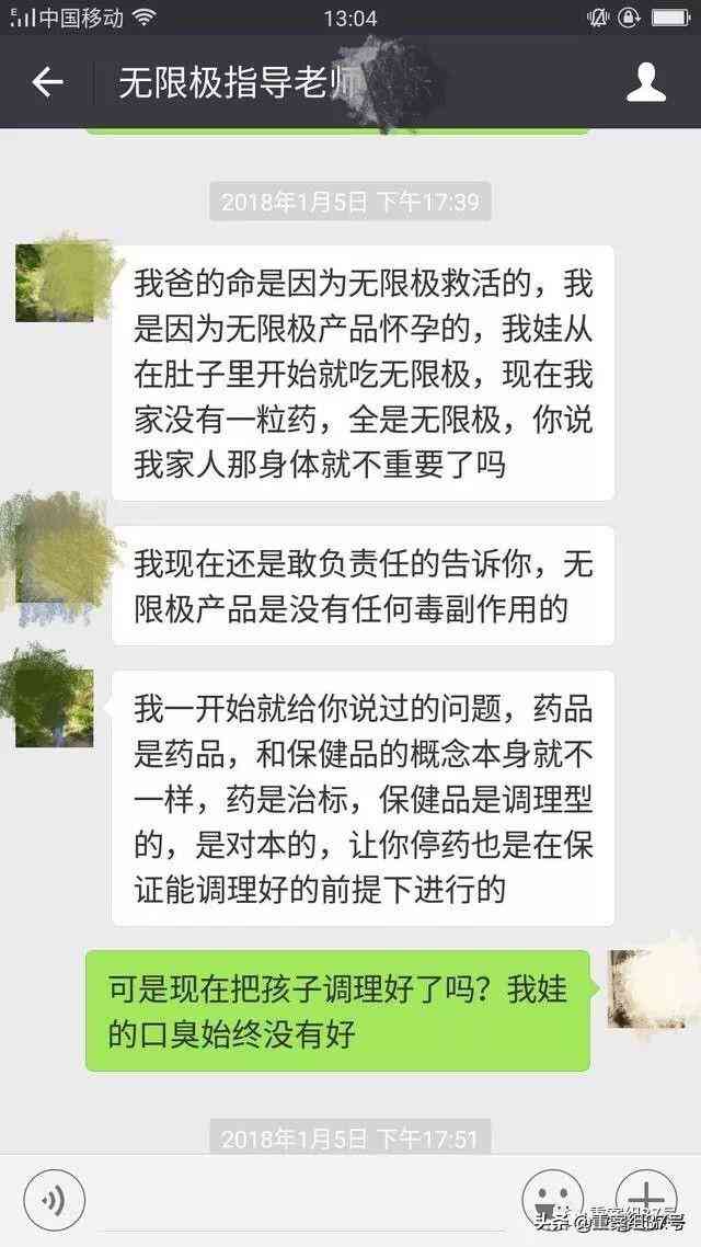 田女士发贴称,在孩子服药期间,她认识在商洛市常欣商店内经营无限极产品的经销商樊某,樊某告诉她,喝无限极的没有任何毒副作用的保健品,就能治好孩子的幽门螺杆菌感染,没必要喝医院的药。在樊某的指导下,田女士给孩子每日大量服用无限极8种产品。到第三个月,她发现孩子出现眼睛充血、异常出汗、头发枯黄等情况,但数次将情况反馈给樊某,得到的回应总是“正常反应,不要去医院,继续服用无限极病就好了,不然就前功尽弃。”