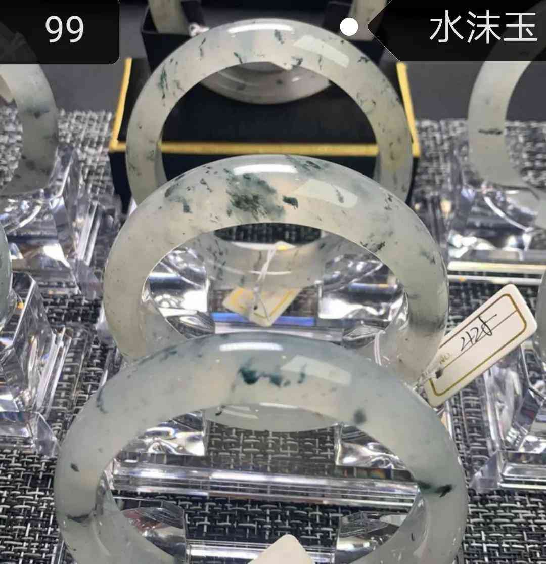 水沫玉手镯的标价100—220的多一些,也有500—600的,个别也有标价1000左右的。这种很像翡翠的水沫玉,很像白色的冰,其上飘蓝花,蓝花颜色很深,像黑斑点。有的水沫玉手镯,通透灰黑。有的通体发黄。有的飘绿色花,很像飘花翡翠。