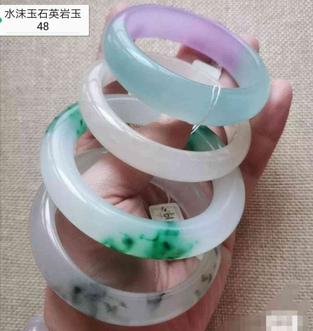 看这四只镯子,卖家介绍,天然水沫玉石英岩玉手镯,实价48,有纹有棉,无裂无扣手,看好再拍不退不换,可小刀。这里要特别注意不退不换四字,就是卖家怕退货。无扣手,意思是用手指甲扣不到裂纹。可小刀,还可以小幅度还价,再想想手工费,这种镯子的质地可想而知。