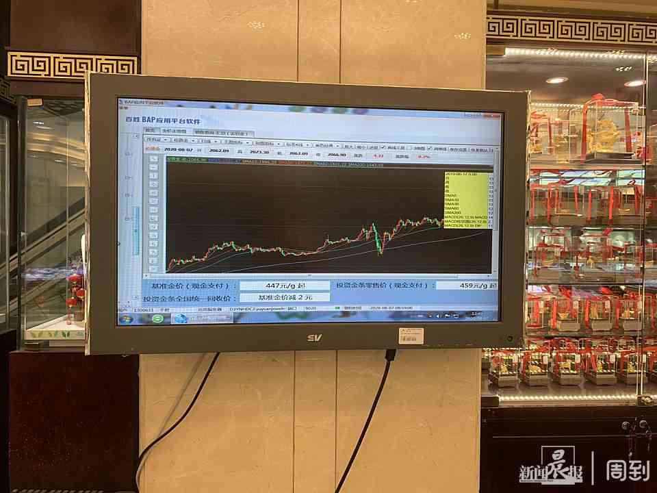 而在老庙黄金南东店里周到君看到,屏幕上显示的今日基准金价为447元/克,而老庙投资类金条回收时每克减2元,生肖类或其他金条回收减4元,其他品牌的金条则要在基准金价的基础上再减8元。