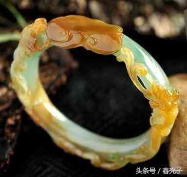六、各式工镯:这个花样就多了,一般是为了一个镯子上出现多种颜色,但是玉种不算上乘,所以有工力的匠人就随俏色做出各种吉祥寓意,龙凤抢珠啦,连年有余(莲叶鲤鱼)啦,福在眼前啦(蝙蝠或蝴蝶和铜钱),玉堂富贵(海棠牡丹)啦。