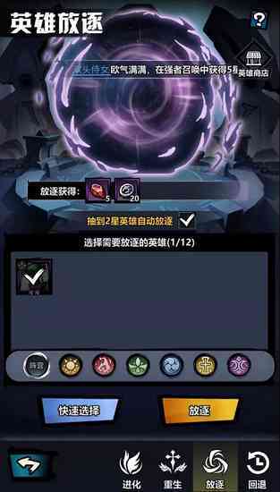 对于《火柴人觉醒》玩家来说,不管是火柴还是英雄招募卷都可以通过任务获得,所以玩家背包中的英雄很容易就能达到上限,其中2星英雄最多。玩家可以通过命运法阵来到放逐界面,将他们转化为进阶石和闪亮硬币。闪亮硬币可以在暮色商店的积分商店中兑换英雄以及英雄碎片。放逐时可以将“抽到2星英雄自动放逐”勾选上,这样就不用每次等背包满后手动分解了。3星英雄不能放逐,但是可以作为狗粮使用。