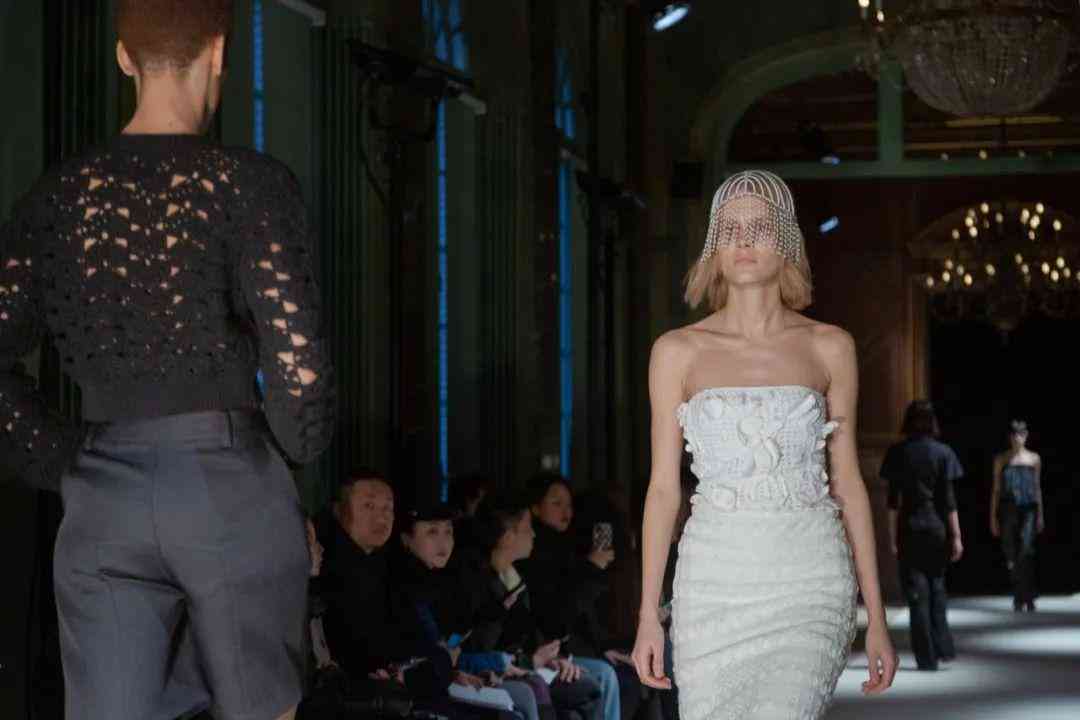 近日,中国年轻设计师罗禹城携同名品牌CALVINLUO回归巴黎时装周线下发布日程。在CALVINLUO 2023秋冬系列中,罗禹城尝试通过面料、工艺与廓形的组合,将柔美与铿锵合二为一。每一处看似随性的褶皱与拼接都在传达关于女性气质的隐喻。轻柔的雪纺与针织面料的经过立体裁剪,塑造出如清风荡漾般自由飘逸的垂坠褶皱,同时在肩部搭配结构感十足的金属弹簧装饰,握住即将随风消散的梦境。