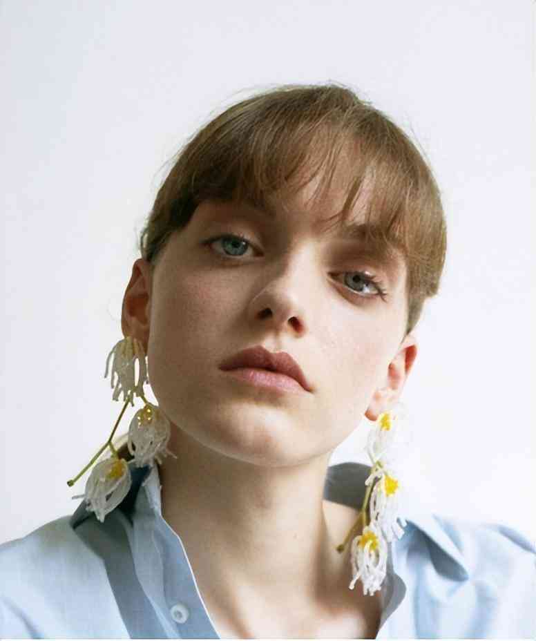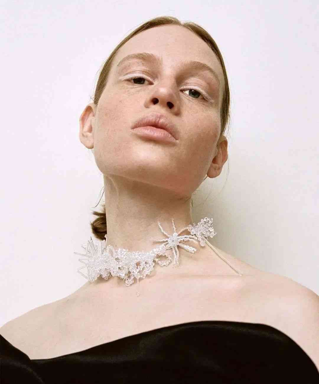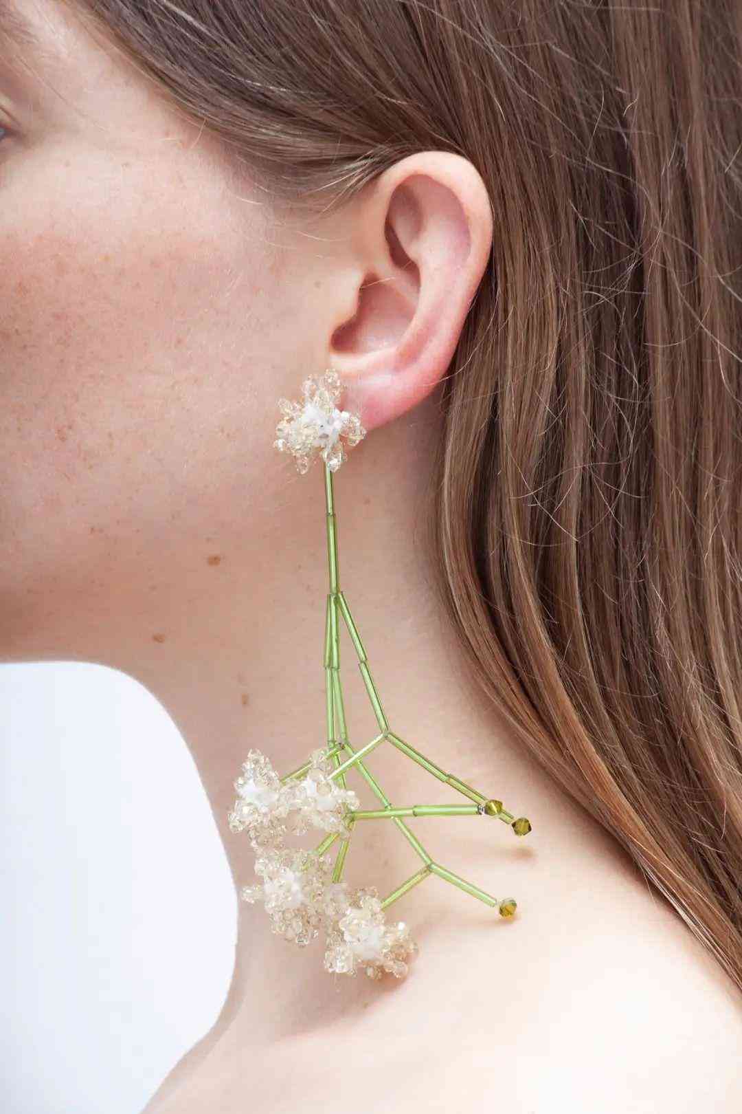 以高质量水晶和玻璃珠用串珠的技法连接在一起,串珠耳环挂在耳垂上让水晶的枝叶沿着脖子慢慢滑落。Helena认为, “我想将做法简单的东西变成更具有价值和贵族气息的事物。”