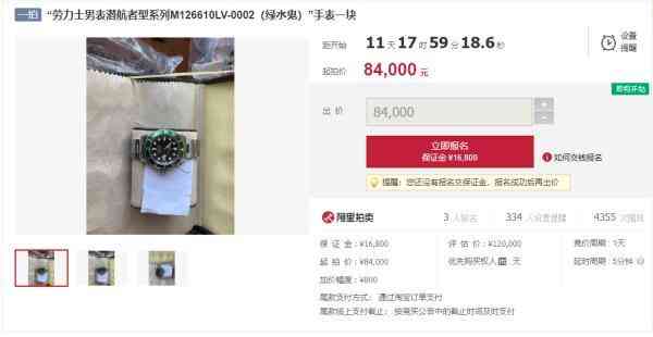 如“劳力士男表潜航者型系列M126610LV-0002”手表一块,评估价:12万元,起拍价:8.4万元。