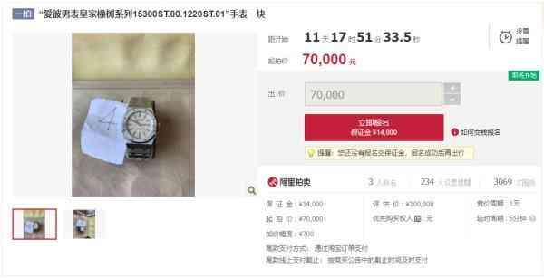 而另一块“爱彼男表皇家橡树系列15300ST.00.1220ST.01”手表,评估价:10万元,起拍价:7万元。